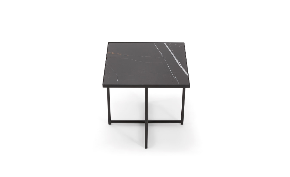 Collezione di tavoli in metallo, abbinati a piani in legno o marmo.