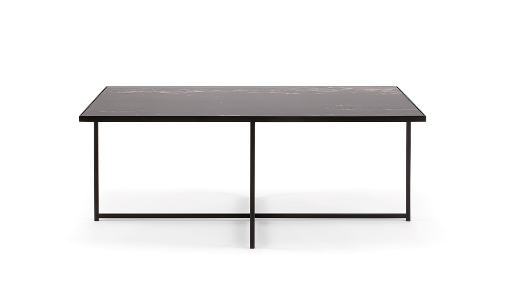 Collezione di tavoli in metallo, abbinati a piani in legno o marmo.