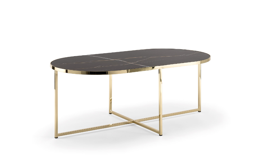 Collezione di tavoli in metallo, abbinati a piani in legno o marmo.