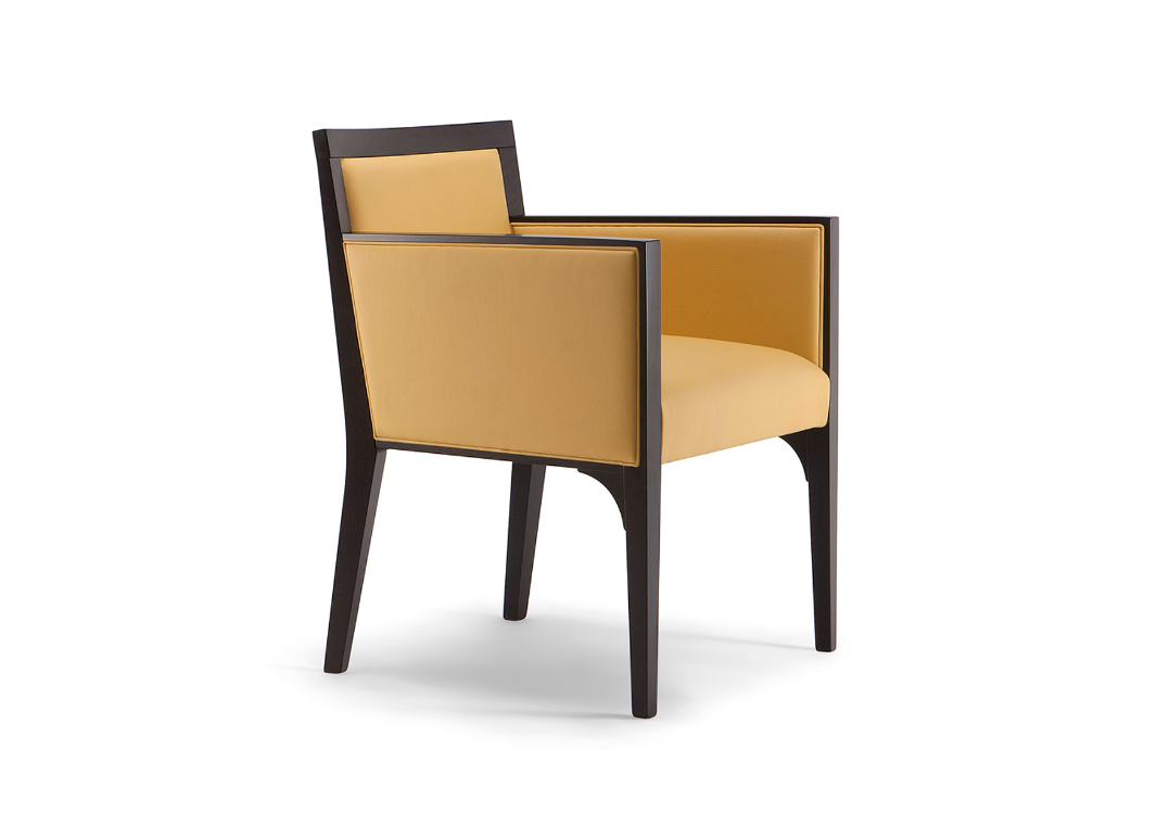 Memorie del 900 e rigore formale contemporaneo, convivono piacevolmentein un'ideale armonia fra il legno, il tessuto e il metallo.La poltrona Ginevra rappresenta un'ottima soluzione per arredare coneleganza ristoranti e hotel. La cornice in legno massello, cosi come le gambe,racchiudono un sedile e uno schienale sapientemente imbottiti.Le diverse tinte del legno, abbinabili a raffinati tessuti, offrono la possibilitadi personalizzare i prodotti e creare match perfetti per ogni spazio.