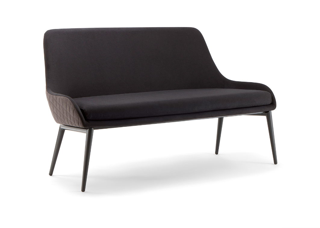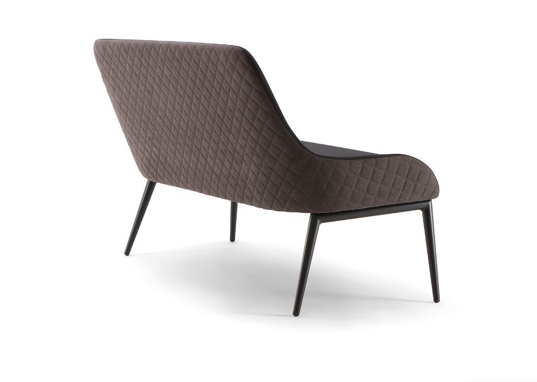 Unispirazione piacevolmente vintage, per una famiglia completa di sedute,con una gamma di basi che spaziano dallegno al metallo.Rivestito da una vasta gamma di tessuti, questo divano  una scelta modernaper lounge, bar, spazi aziendali e hall. Le gambe in metallo caratterizzanoquesta linea rendendo il divano particolarmente leggero e sofisticato.