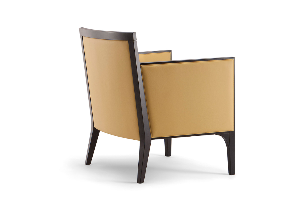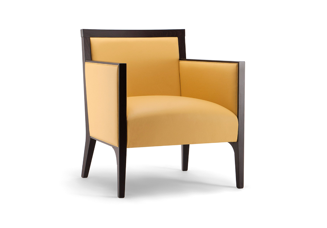 Memorie del 900 e rigore formale contemporaneo, convivono piacevolmentein un'ideale armonia fra il legno, il tessuto e il metallo.La poltrona Ginevra rappresenta un'ottima soluzione per arredare coneleganza ristoranti e hotel. La cornice in legno massello, cosi come le gambe.racchiudono un sedile e uno schienale sapientemente imbottiti.Le diverse tinte del legno, abbinabili a raffinati tessuti, offrono la possibilitadi personalizzare i prodotti e creare match perfetti per ogni spazio.