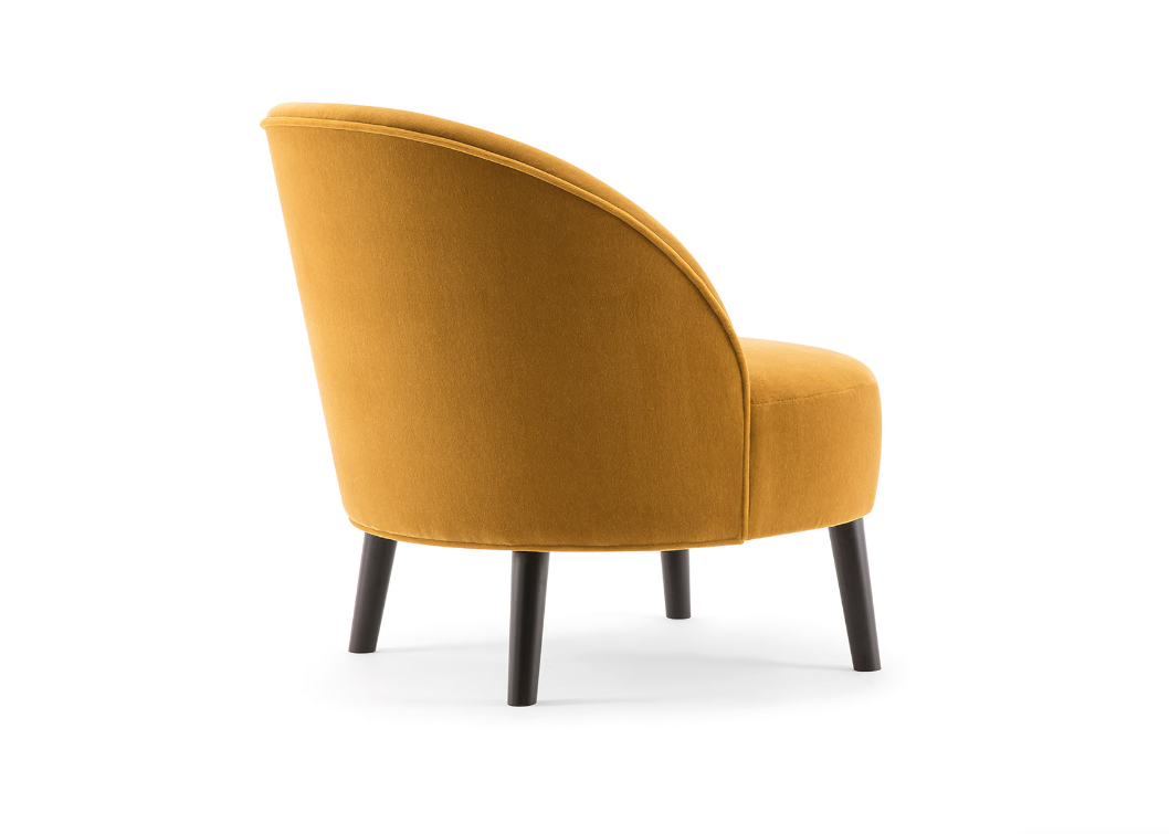 Una seduta perfettamente rotonda e uno schienale curvo si incontrano uniteda una sottile cucitura. Quattro robuste gambe coniche in legno massellosostengono elegantemente la seduta. La sedia Ginger una scelta eleganteper qualsiasi spazio, come boutique hotels e appartamenti di design.Personalizzabile sia nel rivestimento che nella tinta del legno, per adattarlaad ogni ambiente.