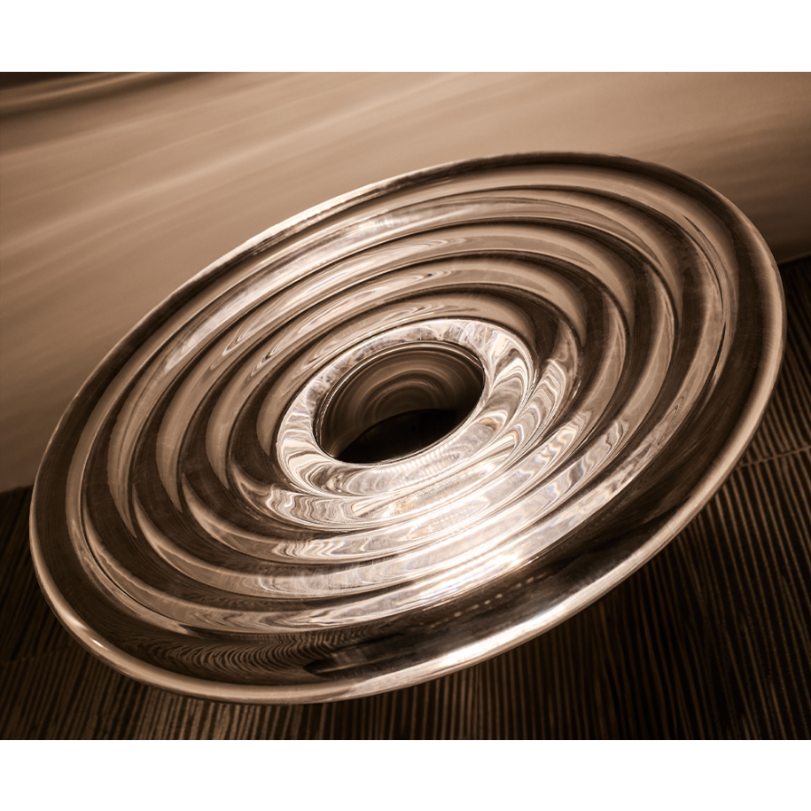 The thickest industrially Pressed glass artefacts designed and engineered to catch and refract light, and to last for ever. Press is a series of heavyweight grooved lighting, vases, bowls and candleholders made of fat, chunky coils of pure and clear transparent glass.