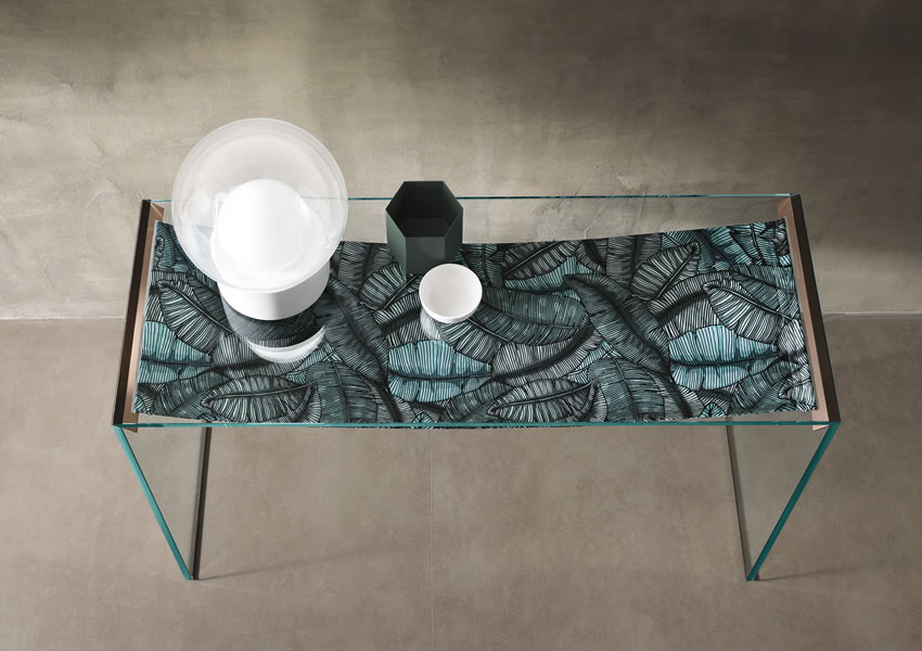 Furniture collection made of console, low table, side table or bed side table with frame in extra clear glass.