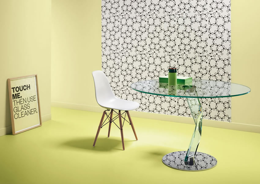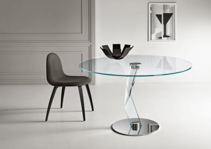 The table top slab creates an elegant contrast with the two sculptured crystal elements that rest on the chrome-plated metal base.