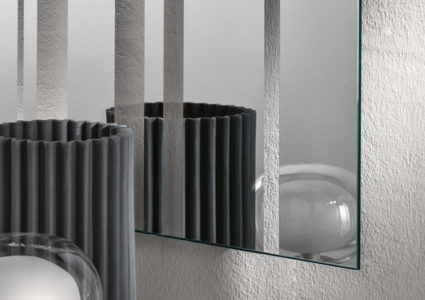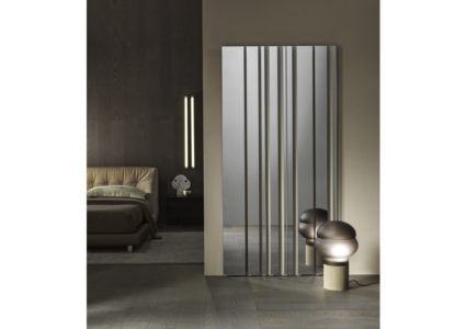 Wall mirror made of a glass panel with mirrored bands alternating with transparent bands.
