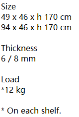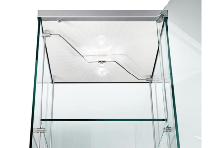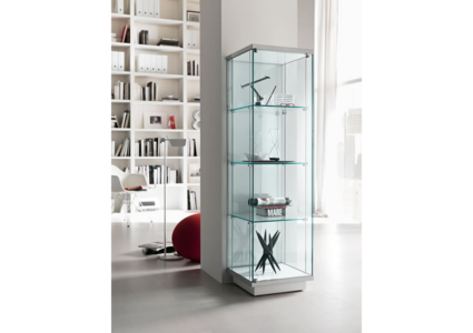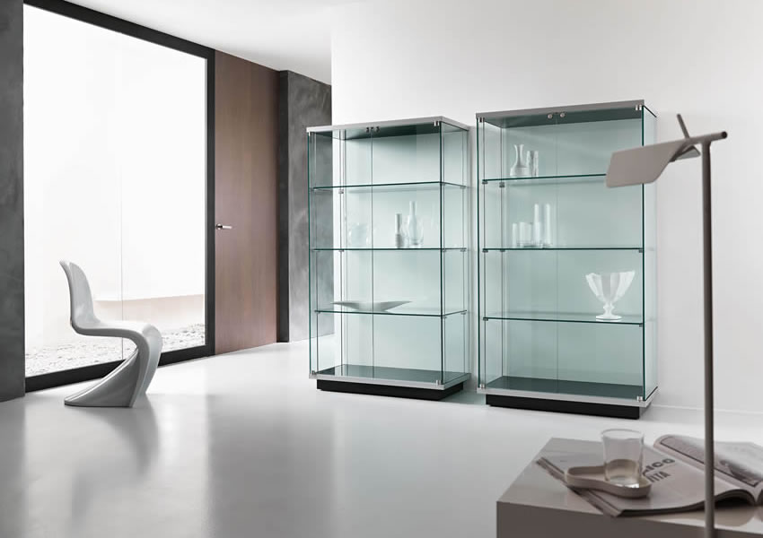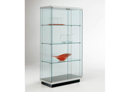 Tempered glass showcase. Base and top in white or black lacquered wood. Optional lighting kit.