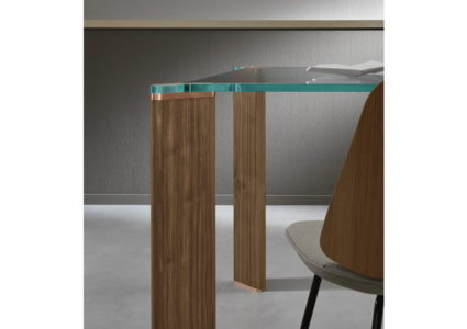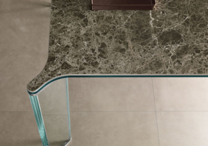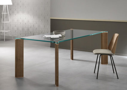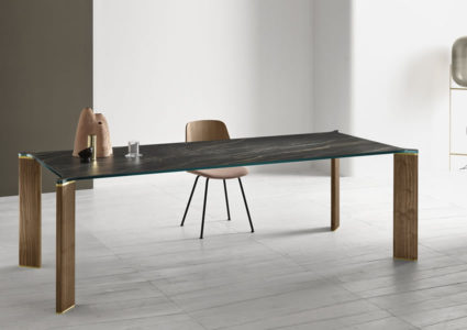 Dining table in stratified glass or ceramic, where the legs define the table top’s form.