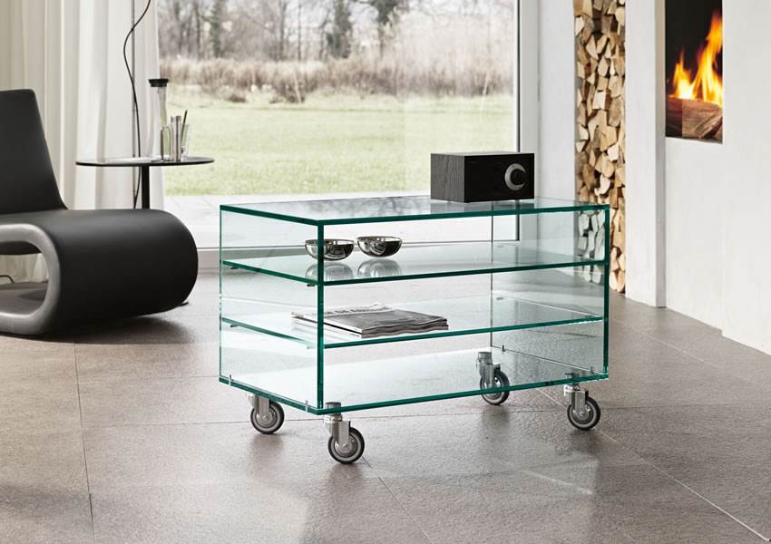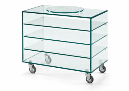 Unit with various shelves available in 2 different widths. Also available with revolving TV shelf. Drawer finishing of Grattacielo fix cm 58 see page 409.