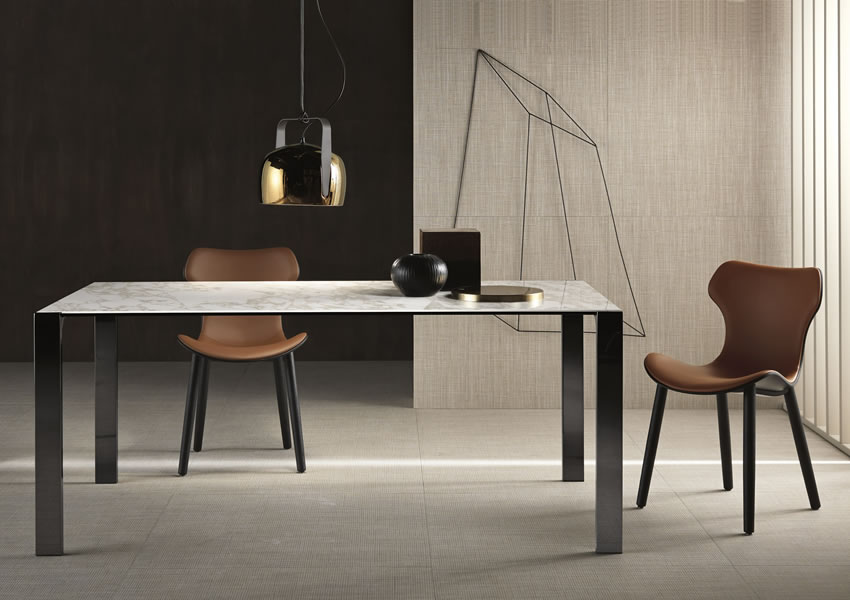 Top in transparent, extraclear or in ceramic. Legs available in chrome, covered with leather, or wood, brushed copper, brushed gold, brushed bronze or gunmetal.