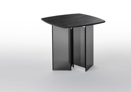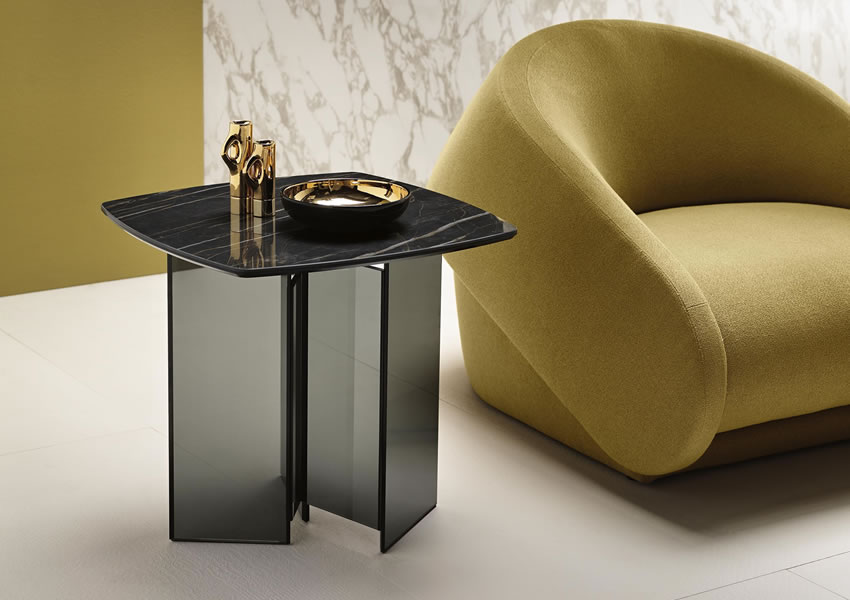 The table tops are in the 3 new polished finishes in ceramic+glass with marble effect.