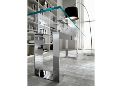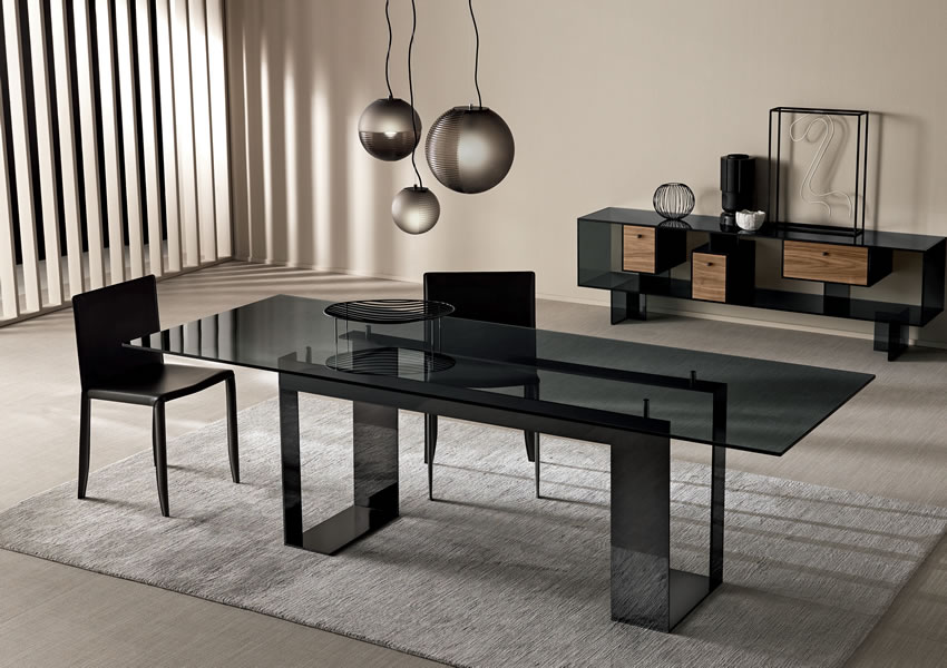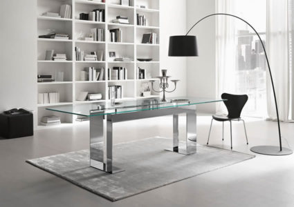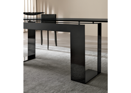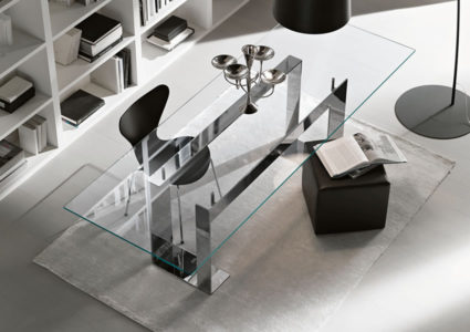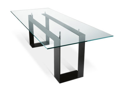 The glass table top is placed on 4 supports that lift the top from the lacquered matt black or white or chrome plated metal base.