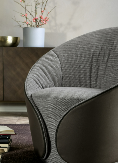 Una collezione decisamente avvolgente che si compone di una sedia, due poltrone ed un divano dal design accattivante e ricercato. L'uso e la combinazione delle migliori pelli e tessuti vestono questa famiglia di sedute massima espressione del Made in Italy.