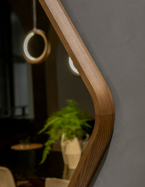 La cornice esagonale è addolcita dalle sinuose simmetrie del legno massello, nelle finiture frassino nero e noce canaletto.
