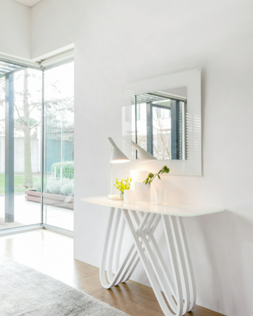 Una serigrafia a cornice, netta, geometrica e precisa, a coronare la semplice modernità della specchiera Toshima.