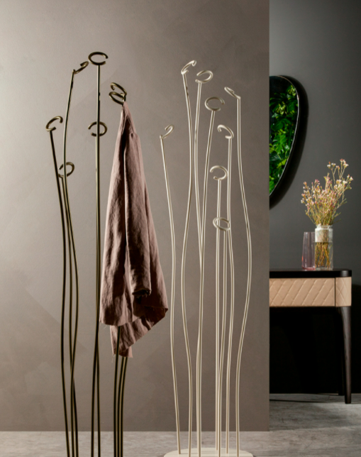 Alga nasce da un'idea di movimento, dalle linee morbide e pacate che si creano nel mondo sottomarino. Una struttura tubulare in metallo laccato che culmina con eleganti cerchi appendiabiti.