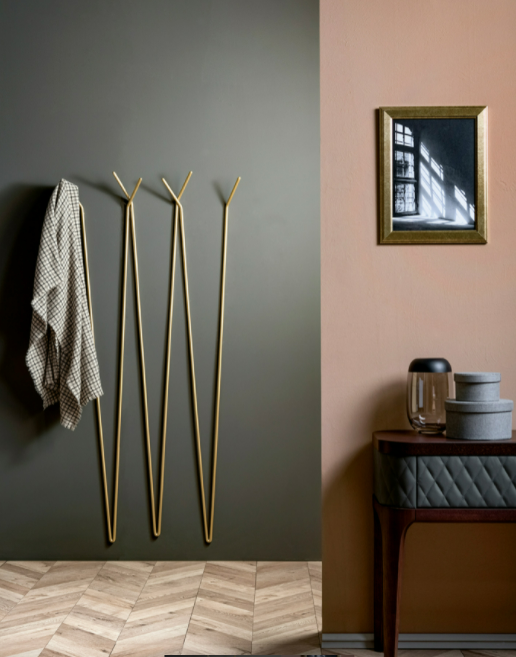 Appendiabiti in filo metallico laccato dal design minimal e funzionale. Disponiobili nelle versioni laccate oro opaco, grigio carbone e bronzo pietra.