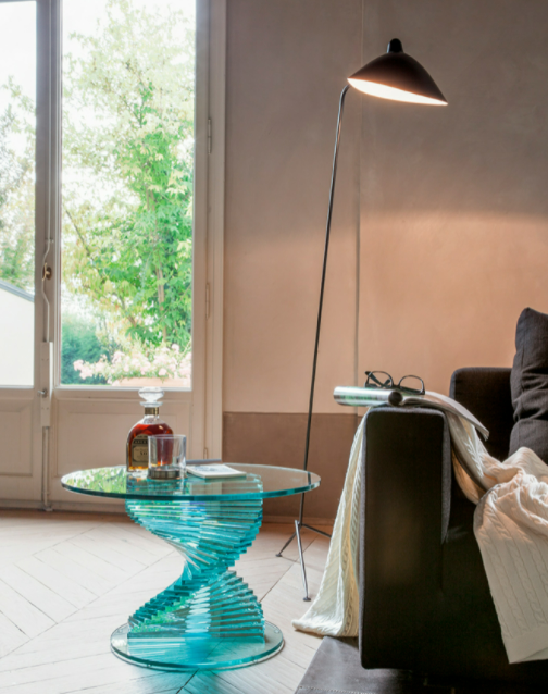 Ariel unisce la rotondità di base e piano, all'algida texture del vetro.