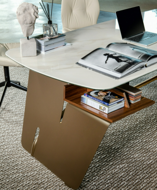 La scrivania direzionale Bridge dalle ampie dimensioni è impreziosita dal top in porcellanato e dalle eleganti finiture in bronzo e oro satinato. Il piano dal profilo morbido e dalla geometria sottile dai bordi smussati offre un appoggio confortevole a chi lavora. La base di Bridge richiama nel nome il suo design evocativo e comunica apertura e dialogo, invitando alla condivisione. Bridge è allestito con cassetto laterale e dotato sul lato esterno di un pratico vano portaoggetti.