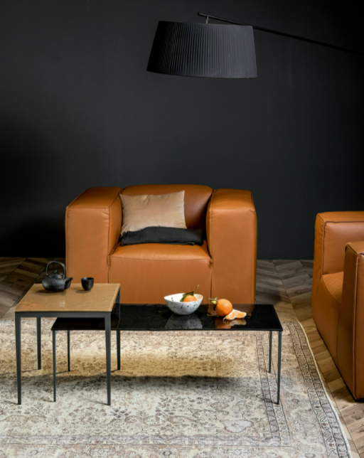 Tavolini con base in metallo laccato e piani in vetro martellato o in legno. Linee semplici che esaltano la matericità dei vari piani.