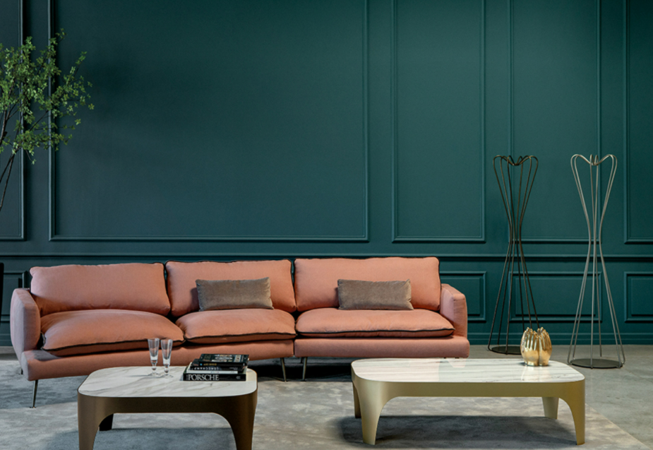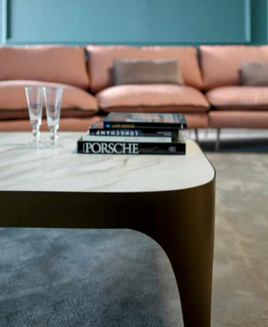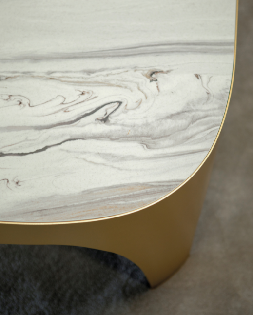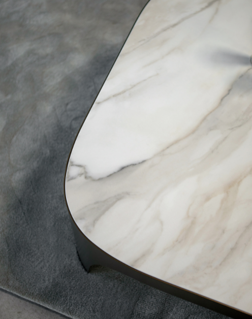 Due tavolini e un servetto dalla struttura sinuosa, in acciaio verniciato con un elegante top in gres porcellanato.