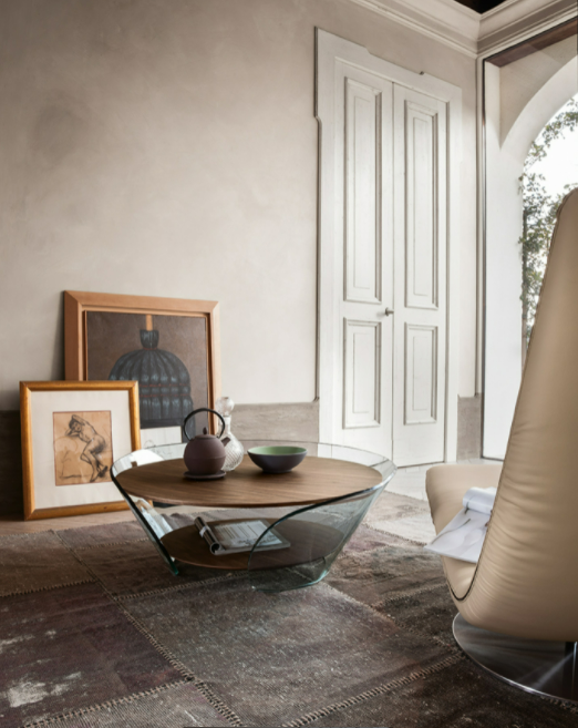 Raffaello rappresenta il risultato di una tecnica elaborata, che permette di creare una base in vetro curvato conica, solida e compatta. Due ripiani in legno rovere scuro, o noce canaletto, marcano la volontà di Tonin Casa di sperimentare sempre e comunque attraverso combinazioni di materiali ed effetti.