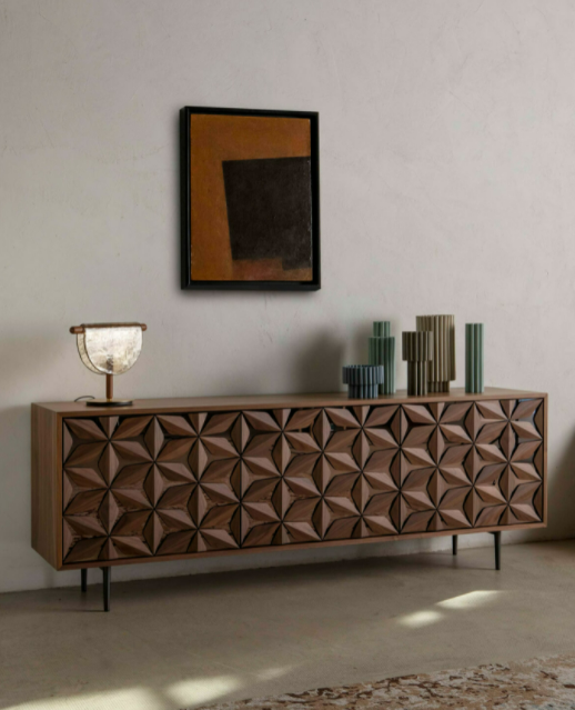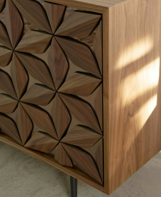 La madia All Star fonde la sua linea essenziale alla preziosa costellazione di petali in legno massello, applicati a mano, che ricoprono le ante dalle basi specchiate, per un elemento unico di design e alta artigianalità.