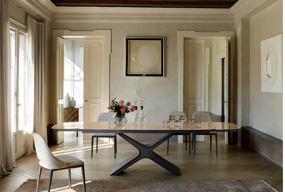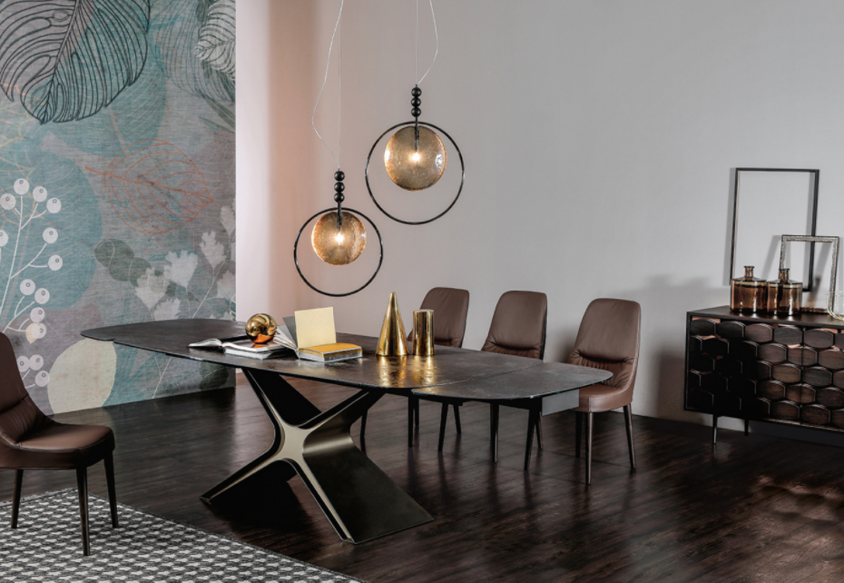Un incontro di linee, allargate e dal centro stabile, con angoli curvati e smussati a ricordare le forme dei velivoli di ultima generazione. Il Tavolo Calliope combina la bellezza dell’acciaio, la sua forza e resistenza, la sua sensazione di modernità, con il lusso di ceramica, vetro, o porcellanato. La contemporaneità può così mescolarsi alla perfezione con il vostro gusto, nel vostro living, per voi.