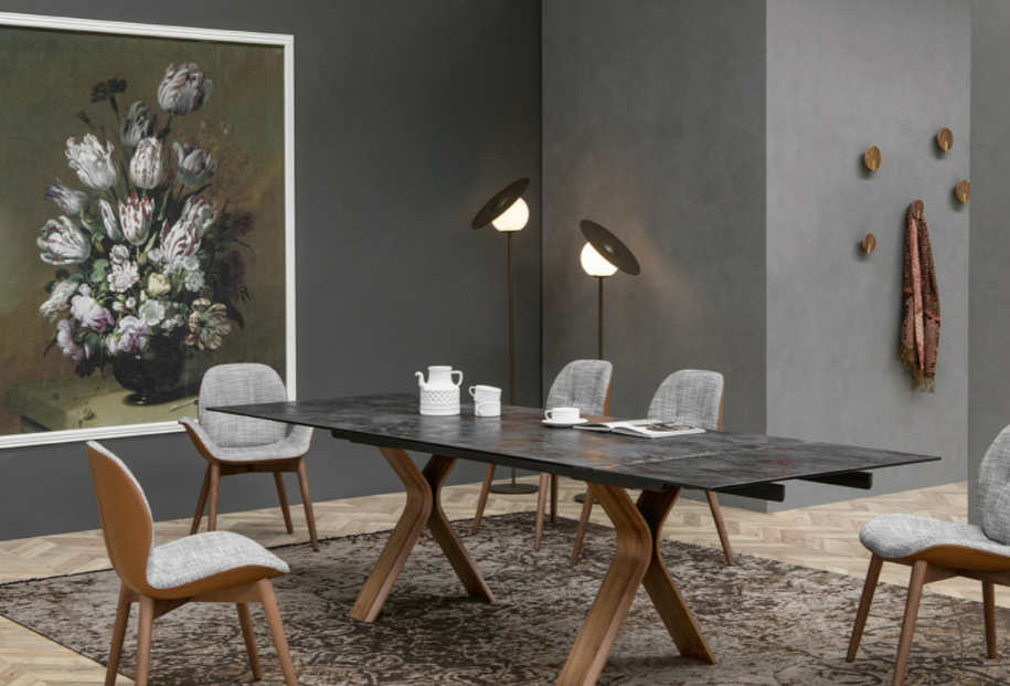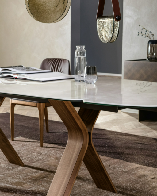 Tavolo fisso o allungabile con base in legno termocurvato, pensata per essere abbinata ad eleganti piani in vetro o gres porcellanato o vetroceramica. Le linee più semplici possono essere le più eleganti e senza tempo.