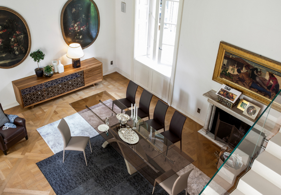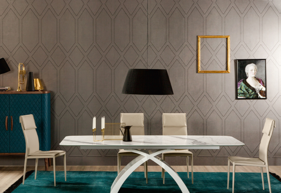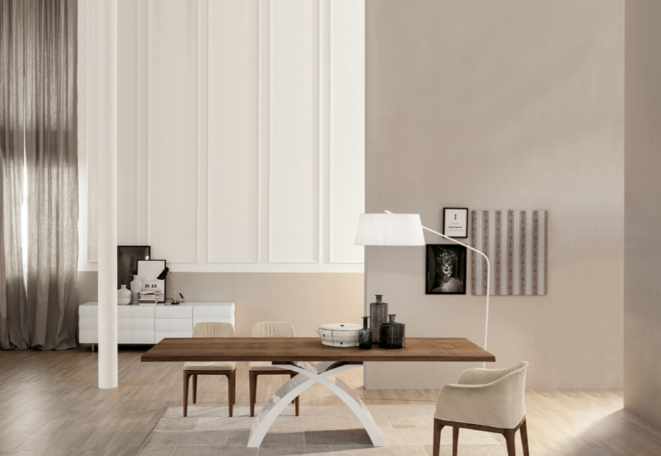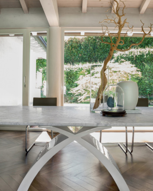 Tokyo è disponibile nella versione fissa, o allungabile con binario in alluminio e piano in vetro, vetro ceramicato, legno o marmo. La base in agglomerato di marmo, la cui curvatura crea un forte dinamismo, è disponibile con una finitura RAL, un dettaglio che permette di personalizzare a piacere la propria sala da pranzo. Le combinazioni che si possono creare sono molteplici, e il design risulta ad un tempo contemporaneo e classico, grazie soprattutto all’innovativo piano allungabile in legno.
