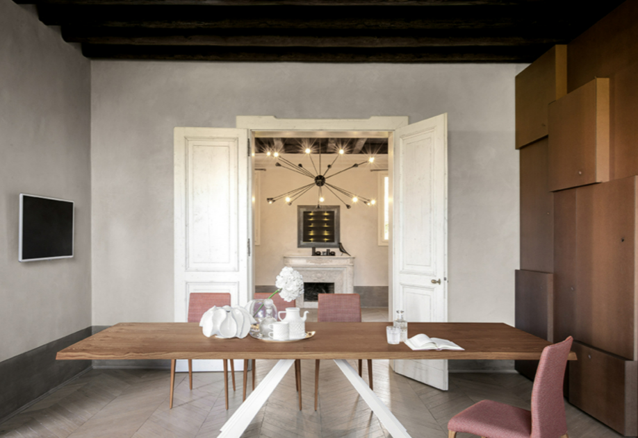 Concepito in Italia e composto di sole materie prime italiane, Ventaglio offre un connubio ideale di sapienza artigiana e qualità. La base del tavolo, e principale caratteristica di questo prodotto, è realizzata in metallo curvato e verniciato in diverse colorazioni. Il piano, allungabile o fisso, è disponibile in vetro, vetro ceramicato e legno. L’eleganza del design si rivela al suo massimo, nella versione allungabile in legno.