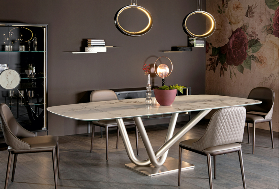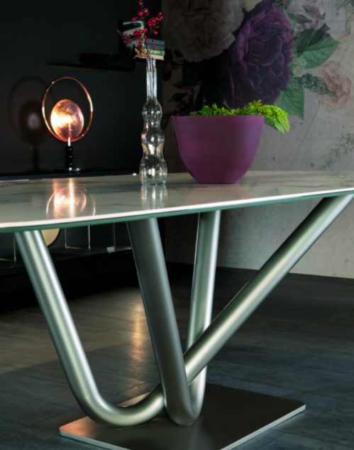 L’eleganza lineare e contemporanea si esprime nel tavolo Victory, dalla personalità definita, caratterizzato dall’armonico accostamento di due solide basi a V in metallo verniciato, che sostengono con leggerezza l’ampio top, personalizzabile nelle varie finiture disponibili, per una soluzione d’arredo dal grande impatto estetico.
