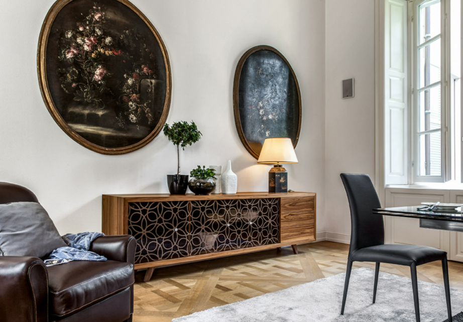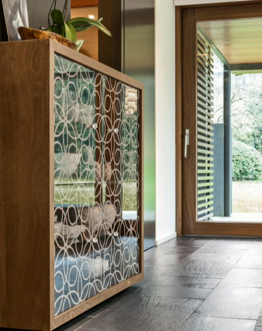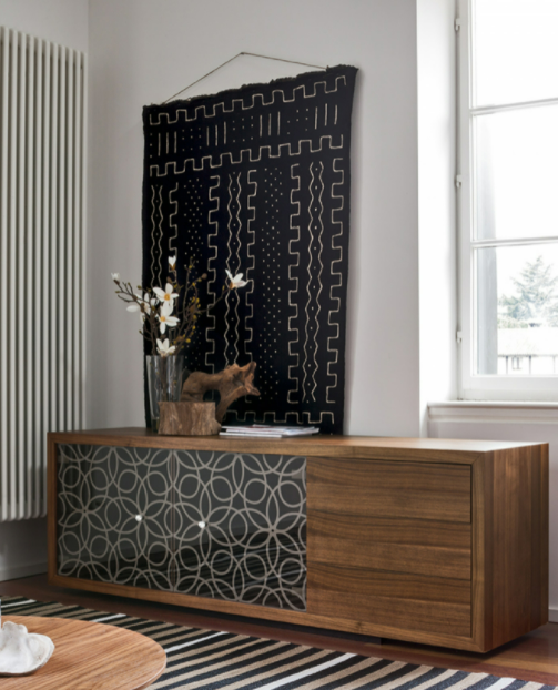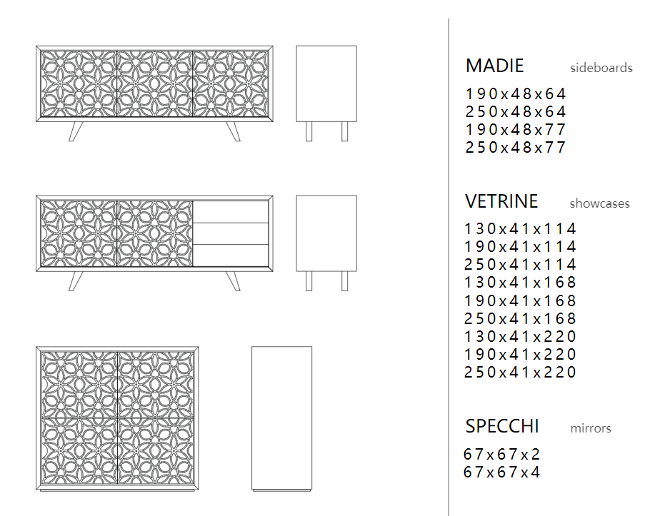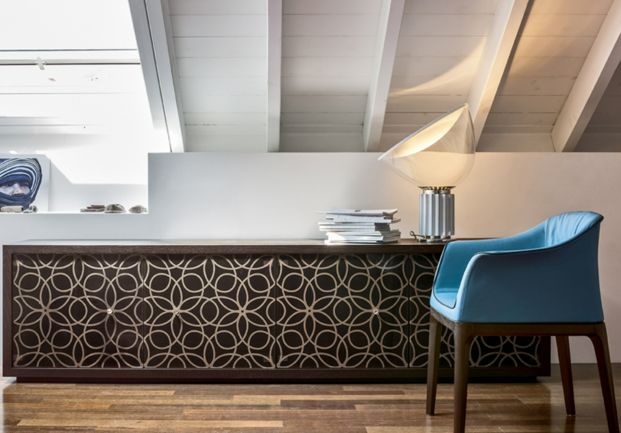 Fantasie barocche si innestano su piani rettangolari, lievi e precisi. Il lusso si presenta qui nella sua veste più pura, in un intreccio di legno e vetro, decorato, arricchito, reso inestimabile dai meravigliosi pomoli Swarovski.