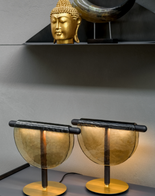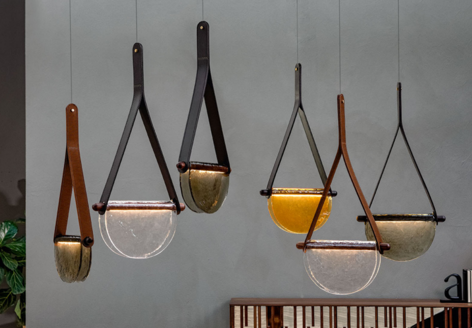 Come gli orologi del grande artista Dalì, il vetro in fusione cola sopra steli di legno rovere massiccio con luce led incassata. Nella versione sospesa il tocco in più è dato dal vero cuoio che la sostiene.