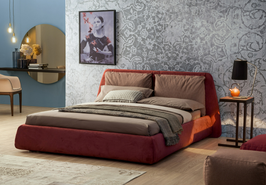 Il letto Dharma va osservato di fronte, da dove si può notare il ring perfettamente in linea con la testiera, un’unione precisa le cui giunture sono pressoché impossibili da individuare. La linea stondata esalta i colori e la texture di tessuti e pelli utilizzati per i rivestimenti, contrapponendo il grande cuscino centrale alla struttura.