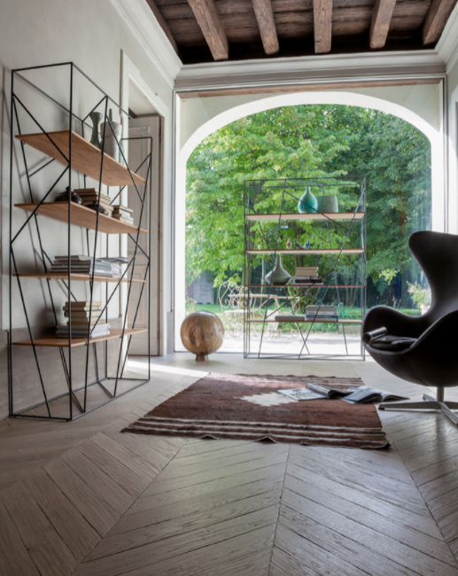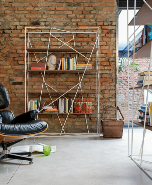Naviglio è un insieme di linee, geometriche e precise, secche e regolari, che formano un particolare mosaico di spazi interrotti. Il metallo verniciato si fonde con i ripiani in vetro o in legno, e raggiunge un perfetto equilibro di spazi e forme.