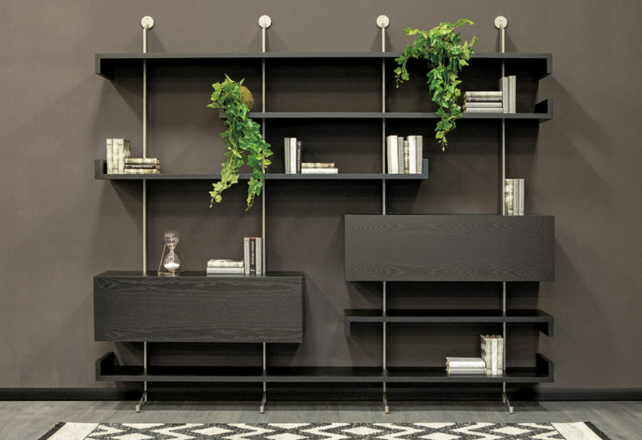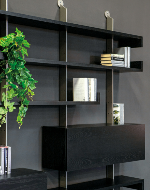 Questa libreria è composta da una serie di mensole che creano movimento, interrompendo la continuità della parete. Oltre ai ripiani, si possono aggiungere anche dei cassettoni di varie dimensioni, così da avere più spazio contenitivo