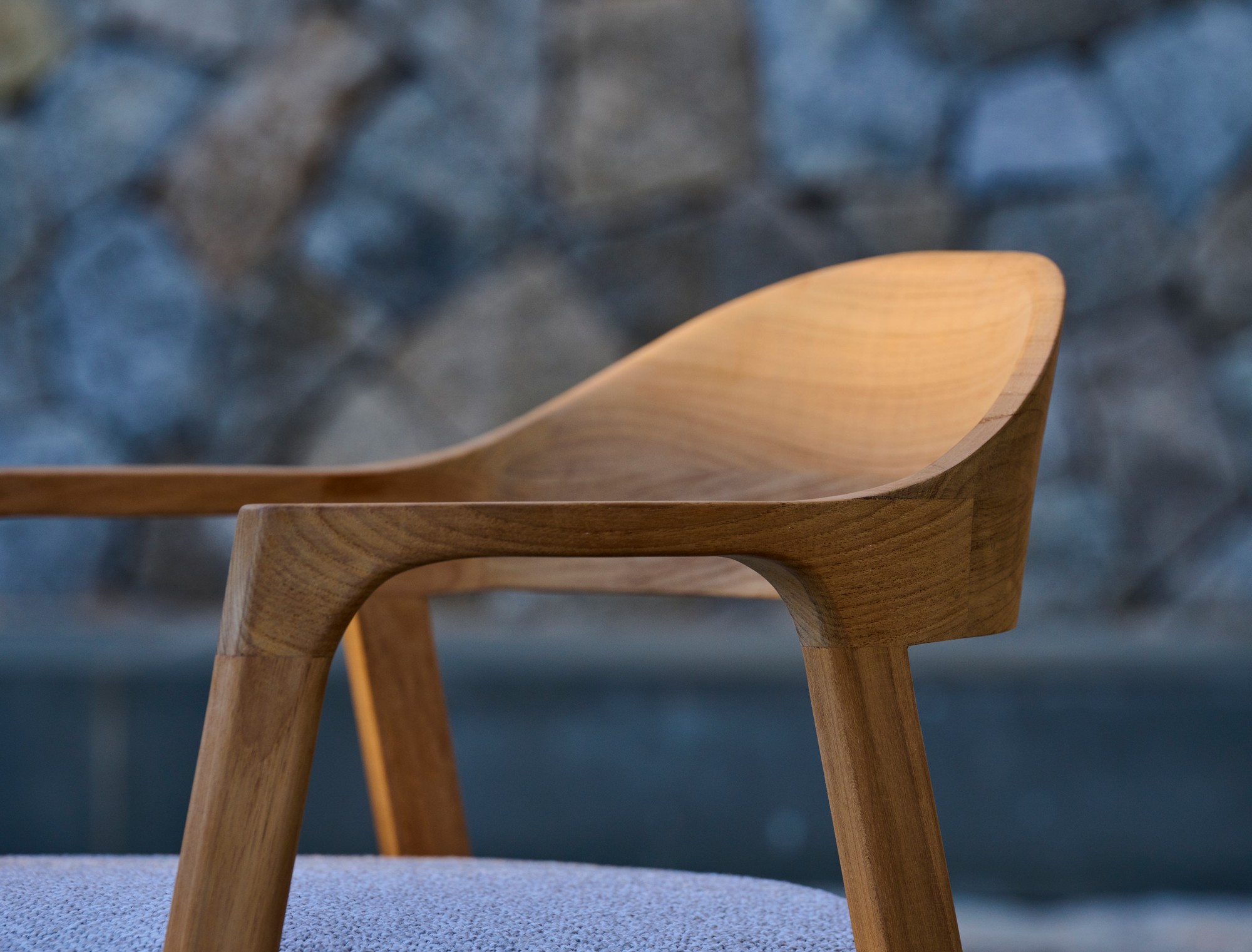 The NOMAD chair emphasises the unique characteristics of teak wood, one being able to sculpt it, like few other kinds of wood. Having extensive knowledge and experience in teak processing, Tribù was able to guide designer Monica Armani from concept to a final design, balancing soft shapes, subtle lines, and skill.
