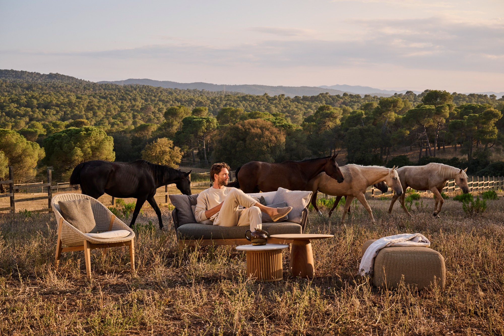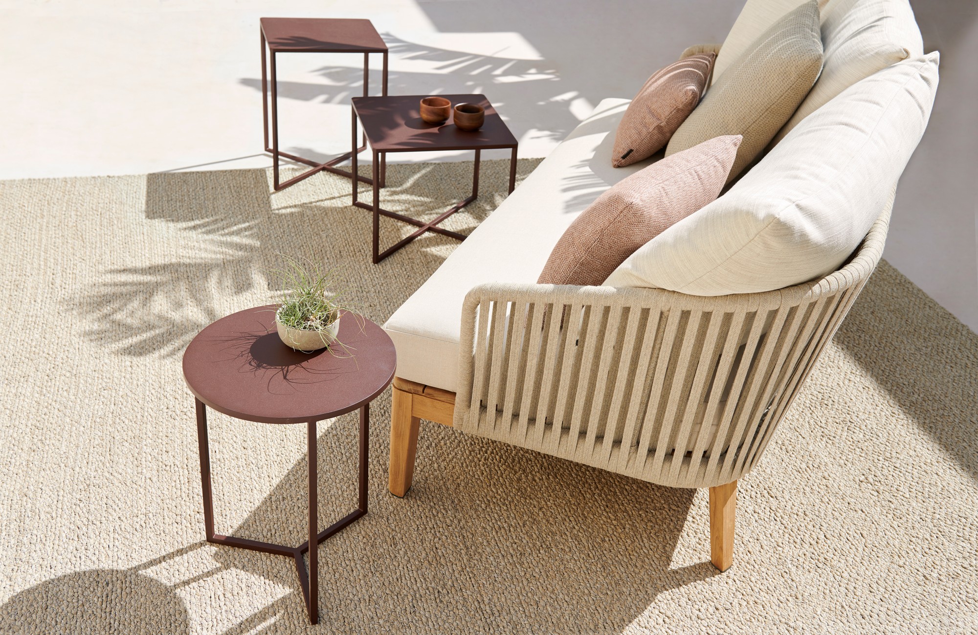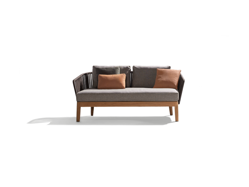The airy design of the Mood collection and its warm combination of teak and handwoven backs will immediately create an intimate atmosphere on your patio. The rounded design of the durable teak gives the sofa a warm and friendly tone. The weave in Tricord has a very soft touch, but can nevertheless defy all weather conditions. Tribù has developed a range of natural colours that fit in with any type of outdoor environment. The comfortable outdoor cushions can be left out in the rain, thanks to the ventilating, water-repellent filling. The back cushions are available in various styles to match every taste.