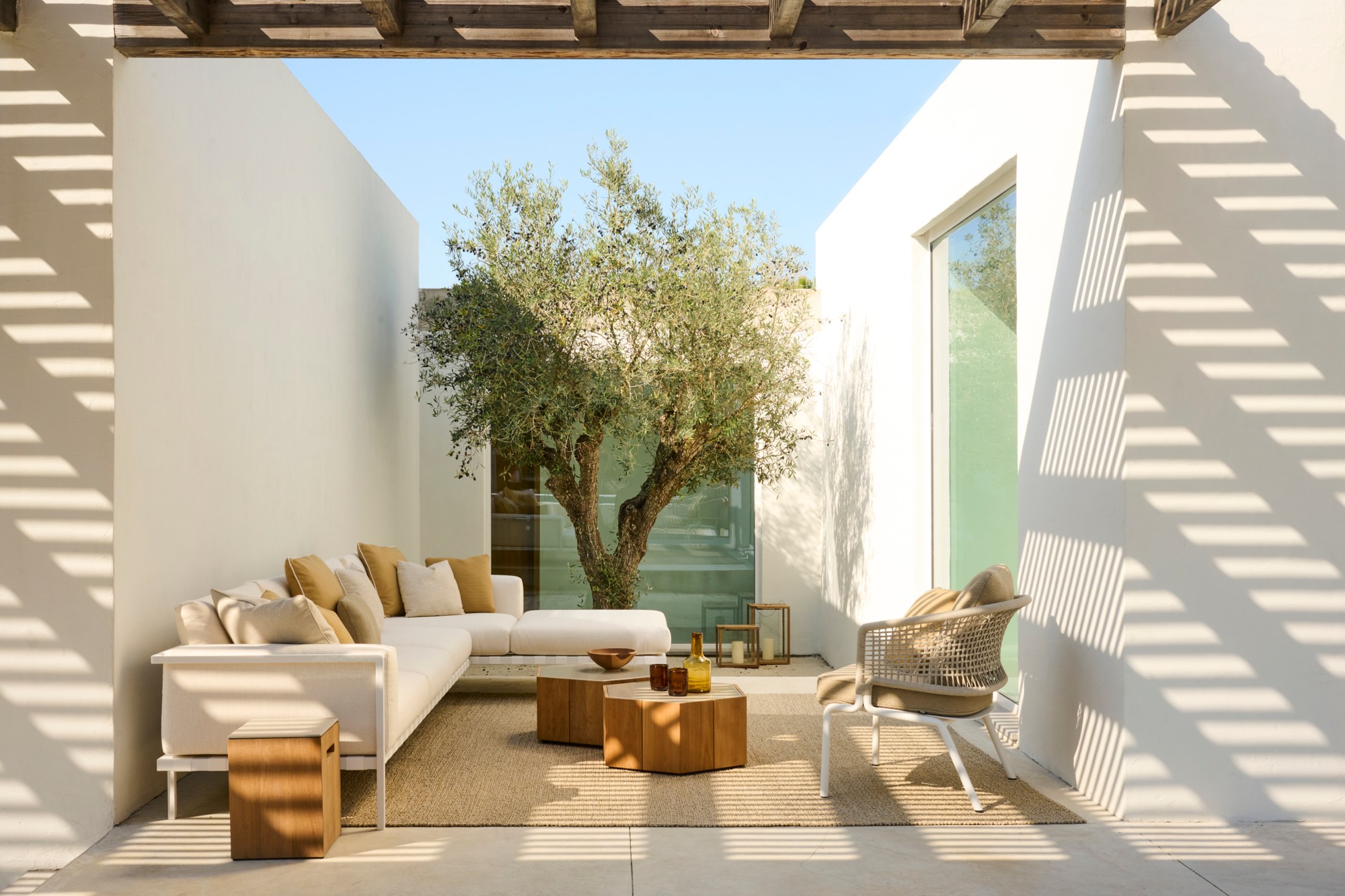 A subtle frame with curved armrests contrasts beautifully with the volume of the cushions, supported by a weave of wide textile straps. Timeless and elegant, the Natal Alu is an outdoor sofa that looks great on any patio. With nineteen different modules, two different seat depths, two available frame colours and more than 100 fabrics to choose from, the possibilities are endless. The aluminium frame is powder coated with ultra-durable, UV- and scratch resistant textured lacquer which provides a beautiful matte look. Special attention has been paid to the outdoor cushions, which have a ventilating, water-repellent filling, so they can easily handle a sudden downpour. The seams have an extra inside cover and the thread used to stitch the seams, swells when wet to further prevent water from penetrating.