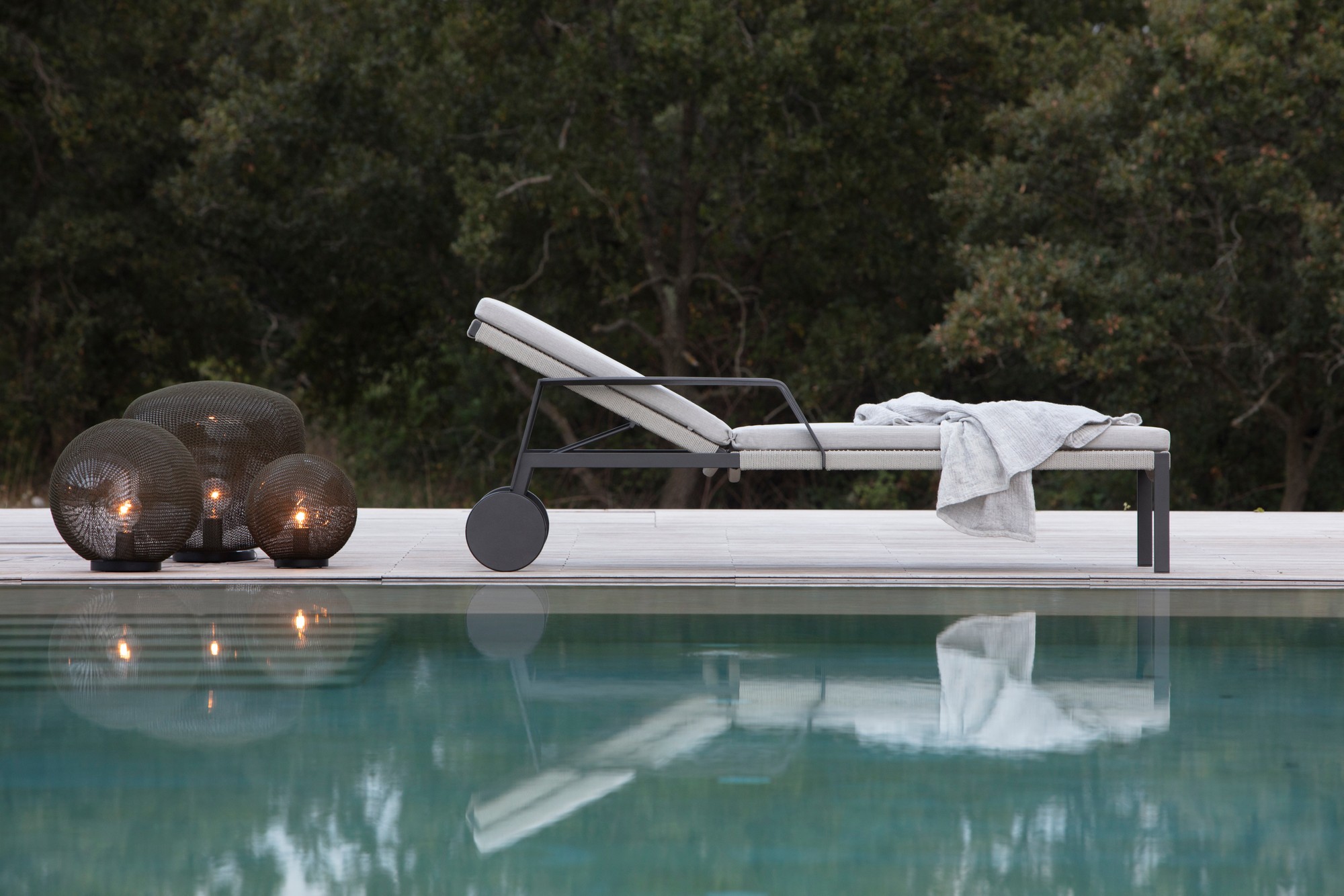 The Nodi lounger combines minimalism with a casual touch. Light and airy, its silhouette is defined by twisted, interlaced rope in weather-resistant Canax?, stretched across a slender, sculptural frame in powdercoated inox. The open weave in Canax?, a combination of PVC and natural hemp, crosses in vertical and horizontal lines, providing shape and structure to the seat and back.
