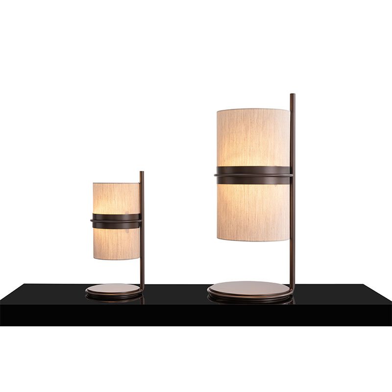 Minimalist design for the Tiubet collection of lighting. The steel band with Silk varnish bronze colour finishing supports and encircles the lampshade, then reconnects to the structure, lending the lamp a bold ‘’suspended’’ effect. The fabric is natural linen.