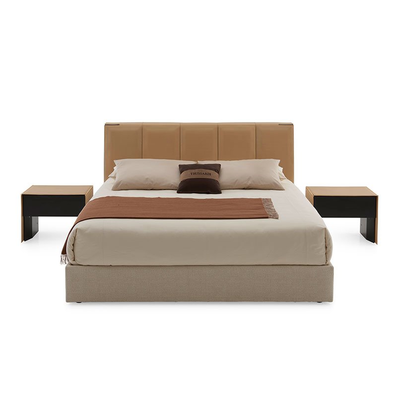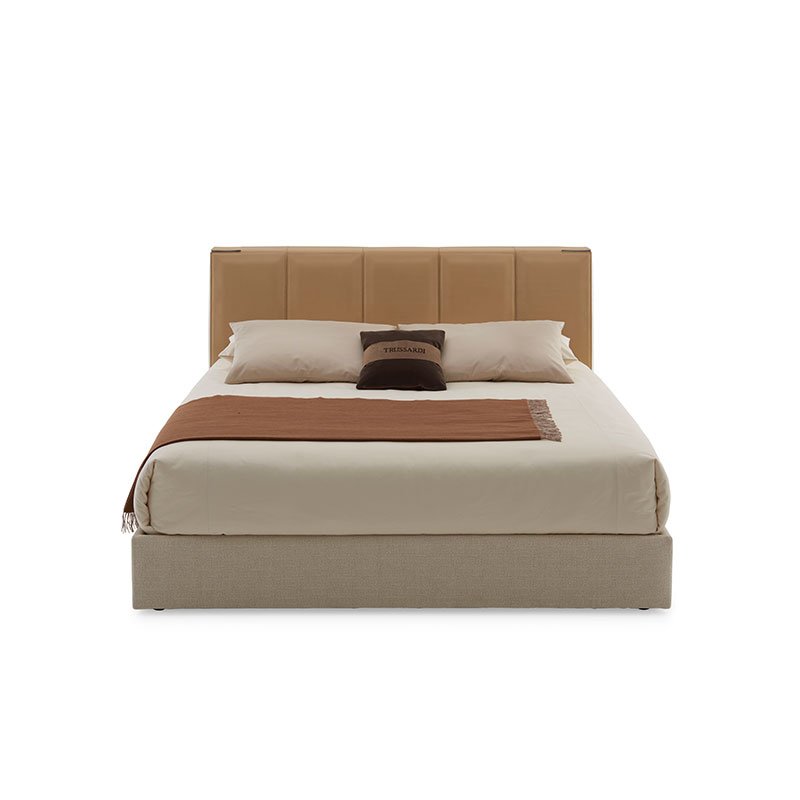 Headboard lateral sides and base are covered in fabric or leather. Steel details with gun-metal grey or polished brass finishing.