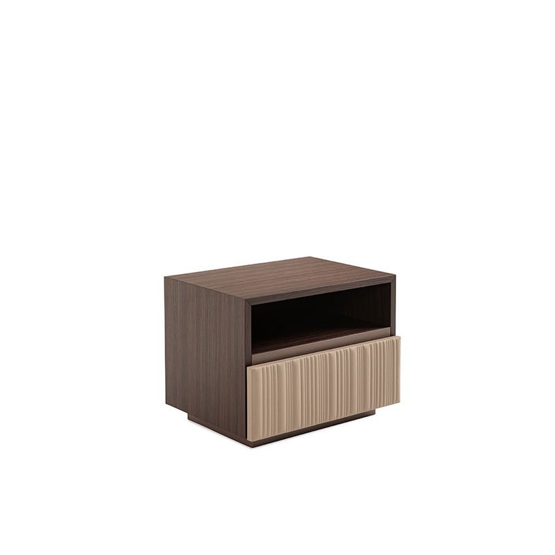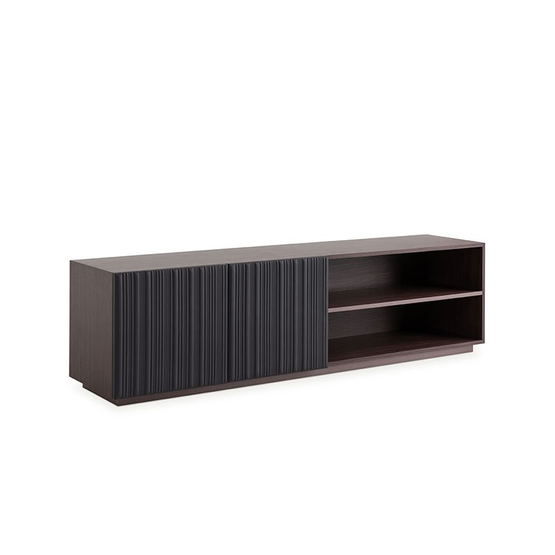 The frame is made of Brazilian Rosewood with Silk varnish bronze color colour decorative finishing. Wooden doors covered in leather with Vertical quilting.