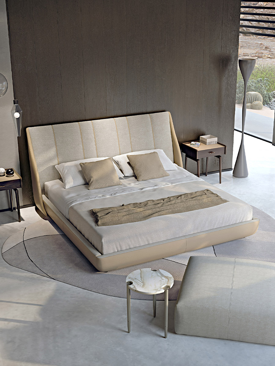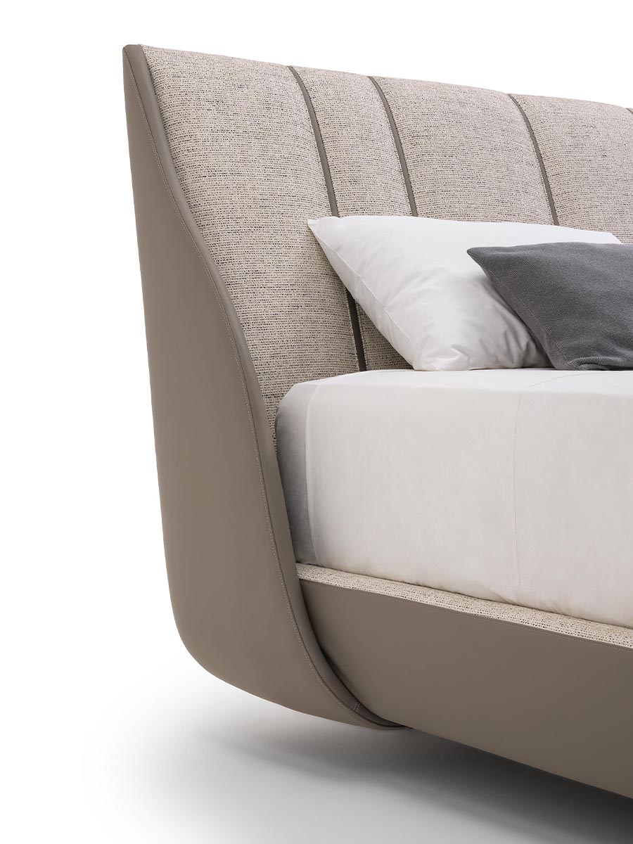The bed of the collection Blues is soft and cozy, fully padded and a pure symbol of comfort and well-being. The upholstery materials, leather and fabric, create an elegant contrasts. The Blues bed is available in different finishes as per sample books.