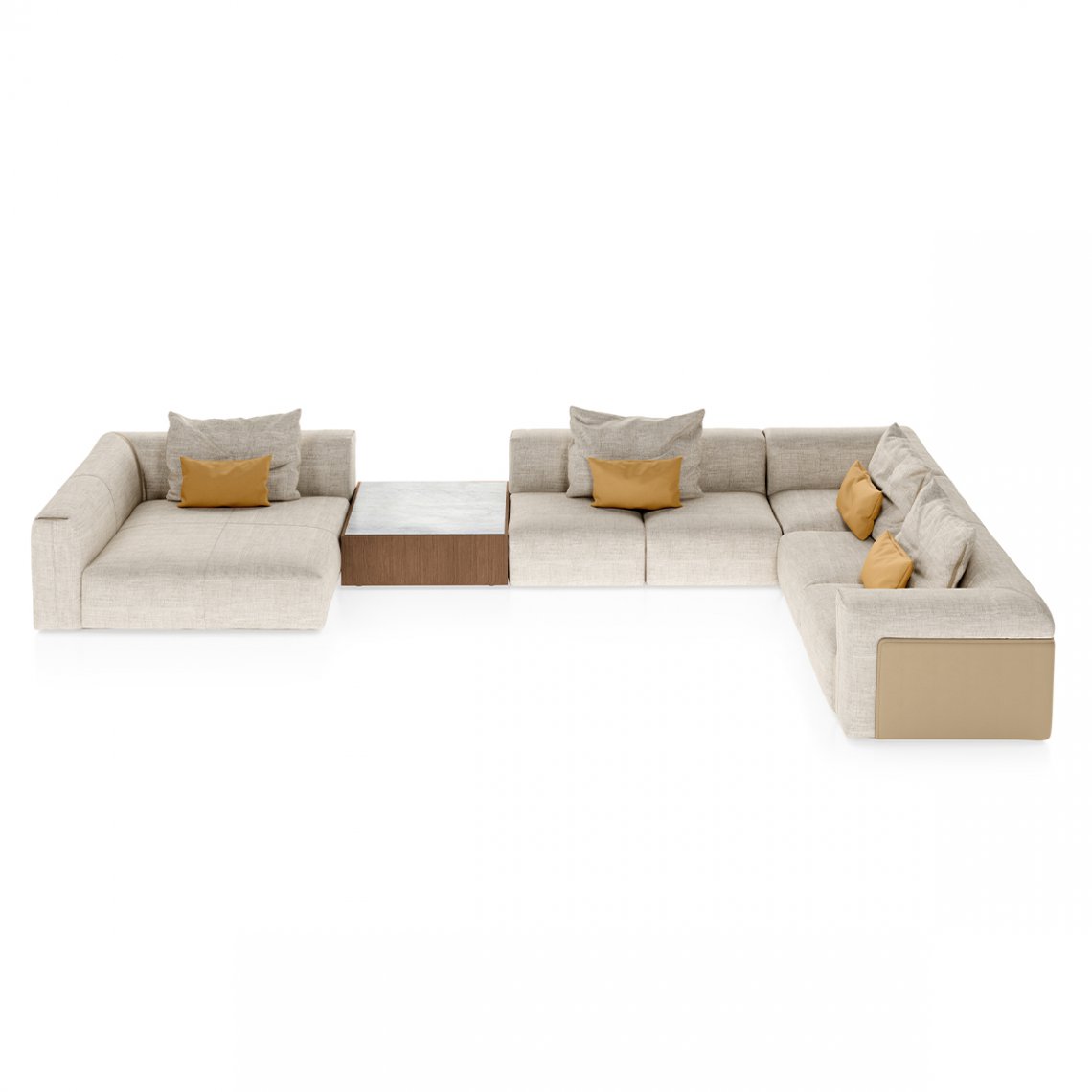 The modular sofa of the Soul collection is a versatile living room. Thanks to the possibility of combining different modules, from corner seats, chaise longue or coffee tables with wooden base and marble top, it allows a wide margin of customization, to create unique pieces of furniture as in the choice of finishes. The Soul modular sofa is available in different finishes as per our samples book.