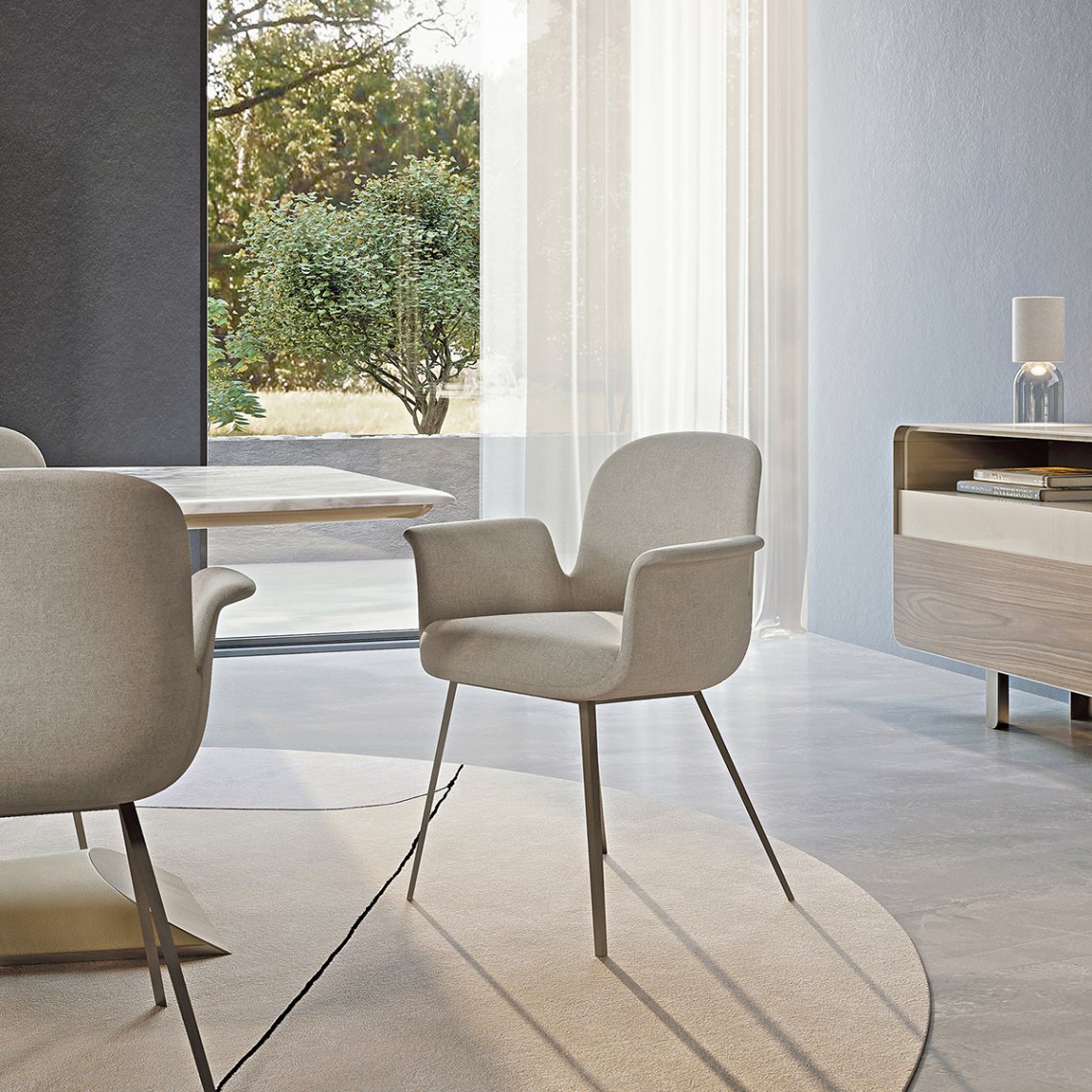 The Soul chair, designed to surround the table, is even more comfortable and welcoming thanks to the presence of the armrests integrated into the seat. Upholstered in leather or fabric, the chair has metal legs in Matt Light Platinum finish. The Soul chair is available in different finishes included in our collection.