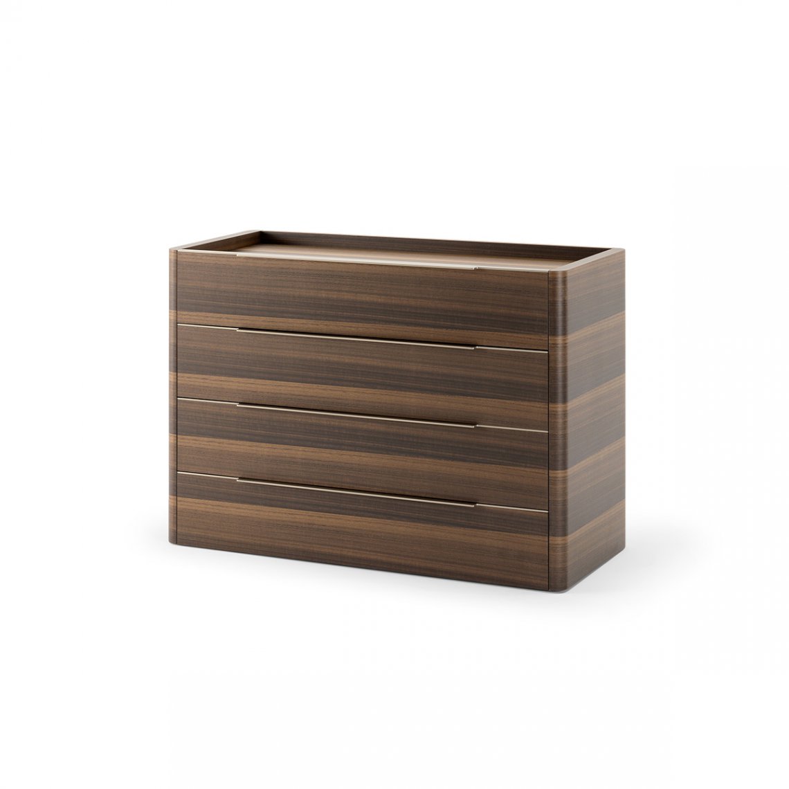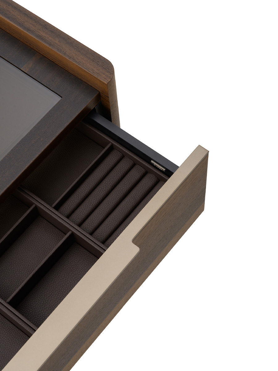The ches of drawers of Domus collection has shapes made elegant by the sides with curved corners and by the long handle with curved metal silhouette. The structure, the top and the drawers are in Eucalyptus, while the details and the handles in Matt Light Platinum metal. The Domus chest of drawers is available in different finishes as per sample card.