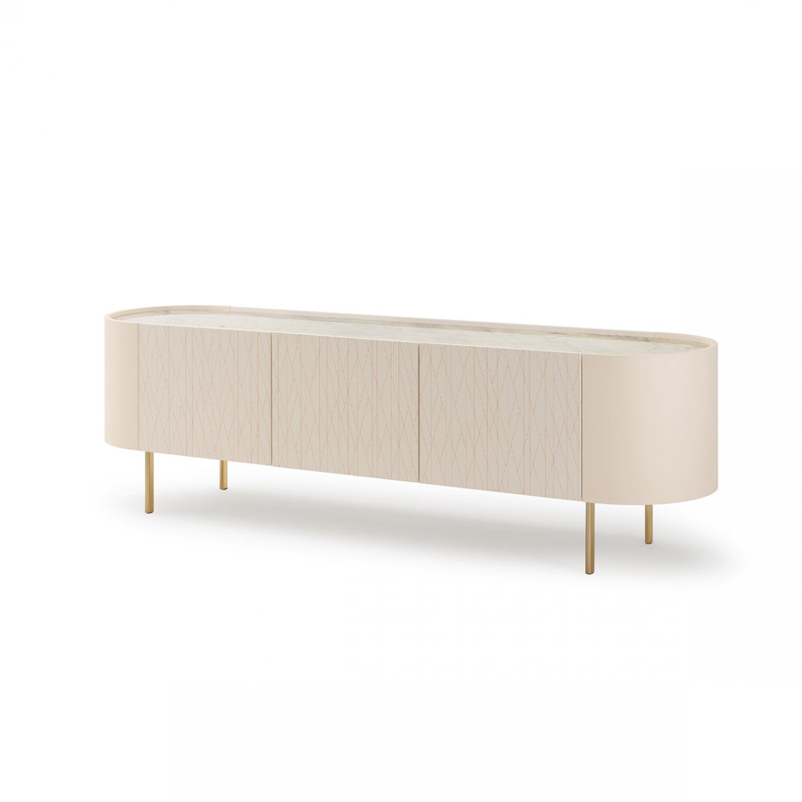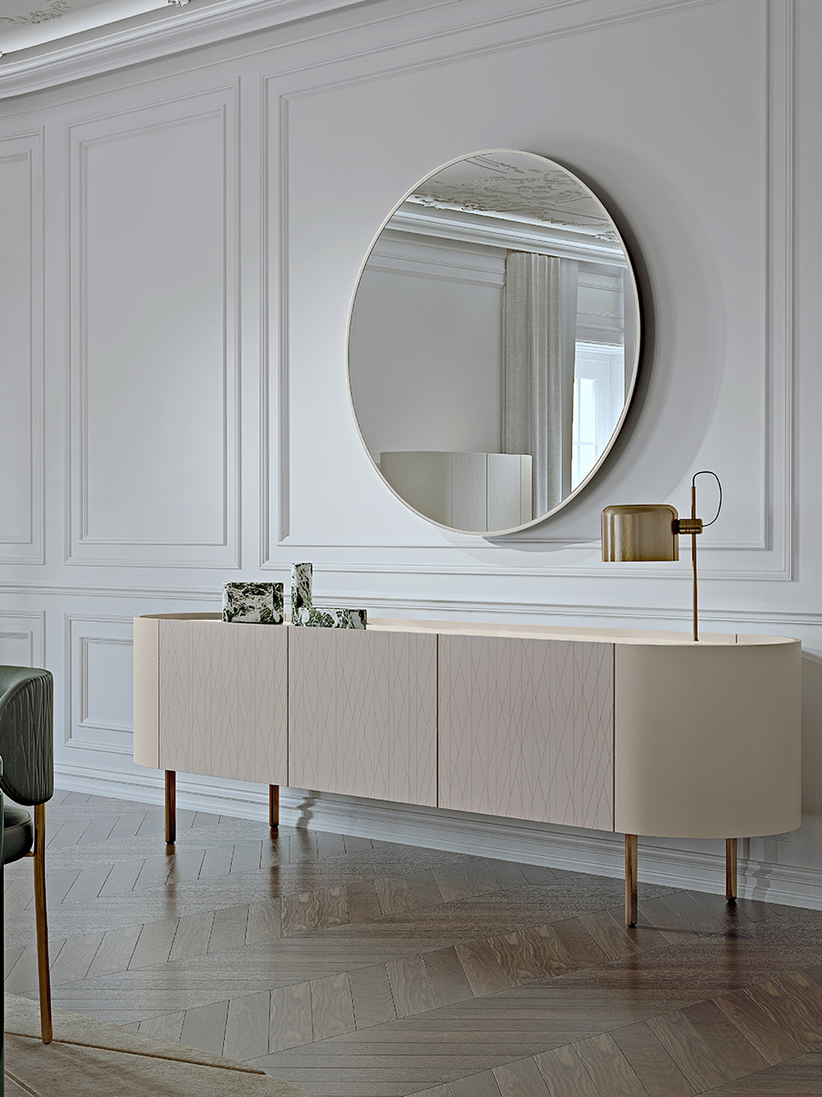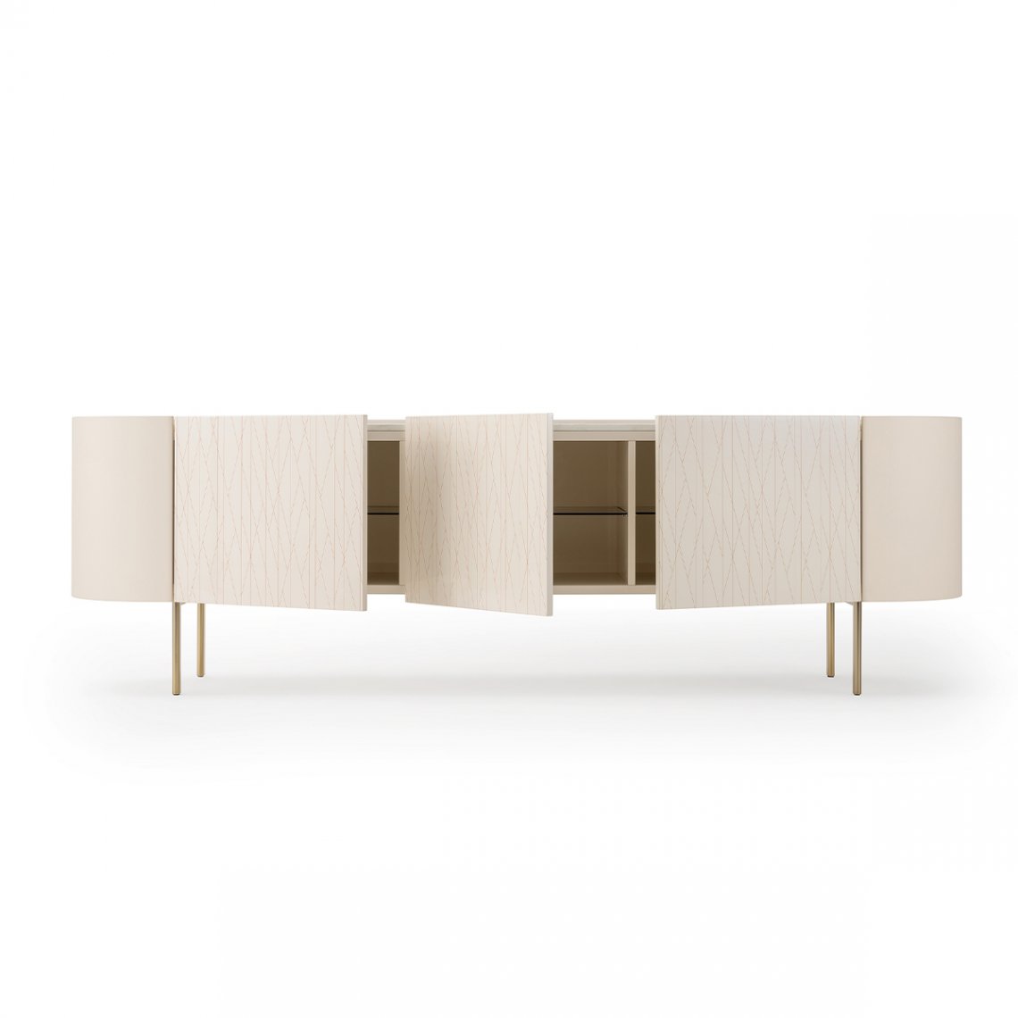 The design of the Roman sideboard features wooden or glass doors. The wooden version can be customized with geometric patterns for decoration. The Roman sideboard has different finishes as shown on the sample card.